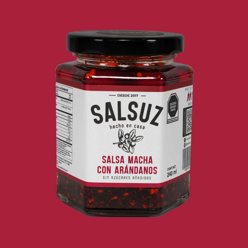 Deliciosa salsa de chile morita con arándanos secos, cacahuate horneado, ajonjolí dulce y aceite de canola.